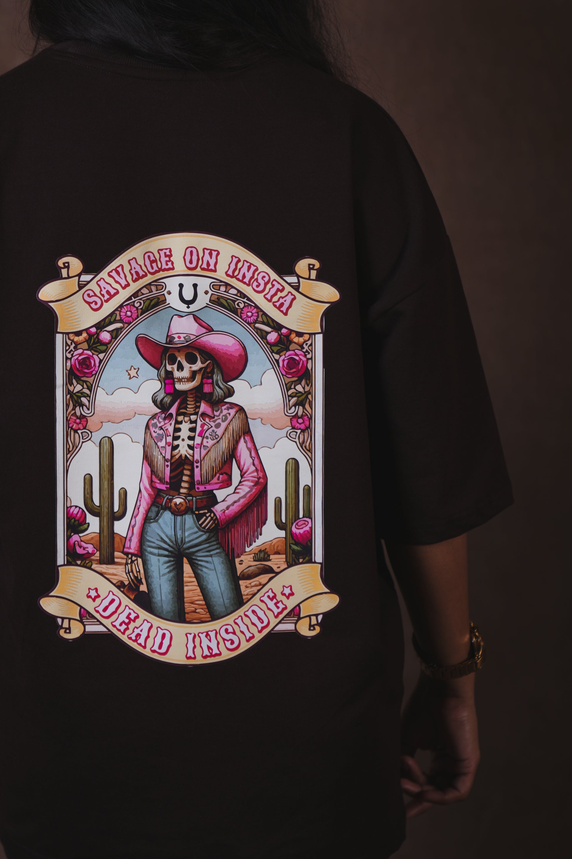 - The design includes a vintage-inspired banner that reads "Savage on Insta, Dead Inside."