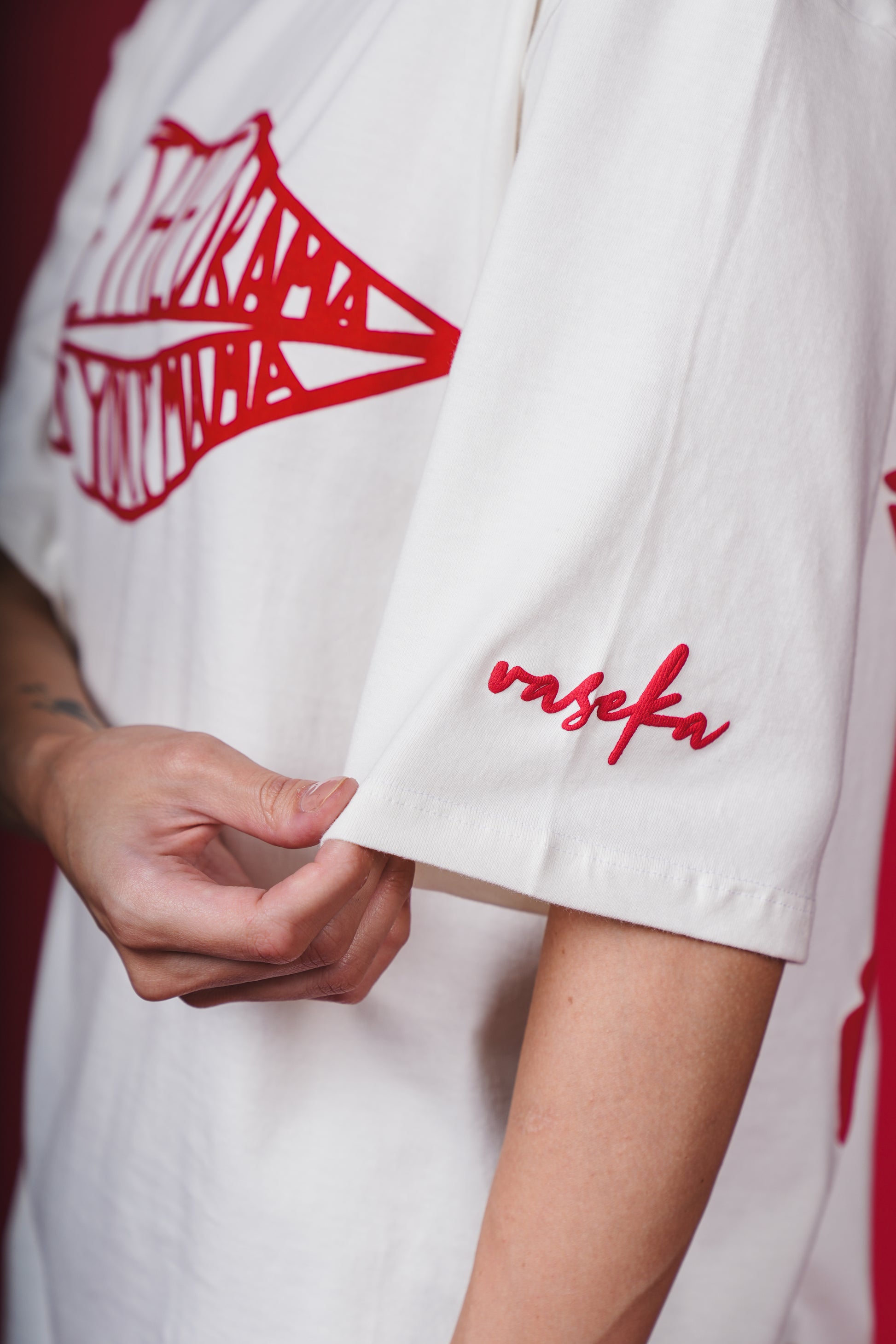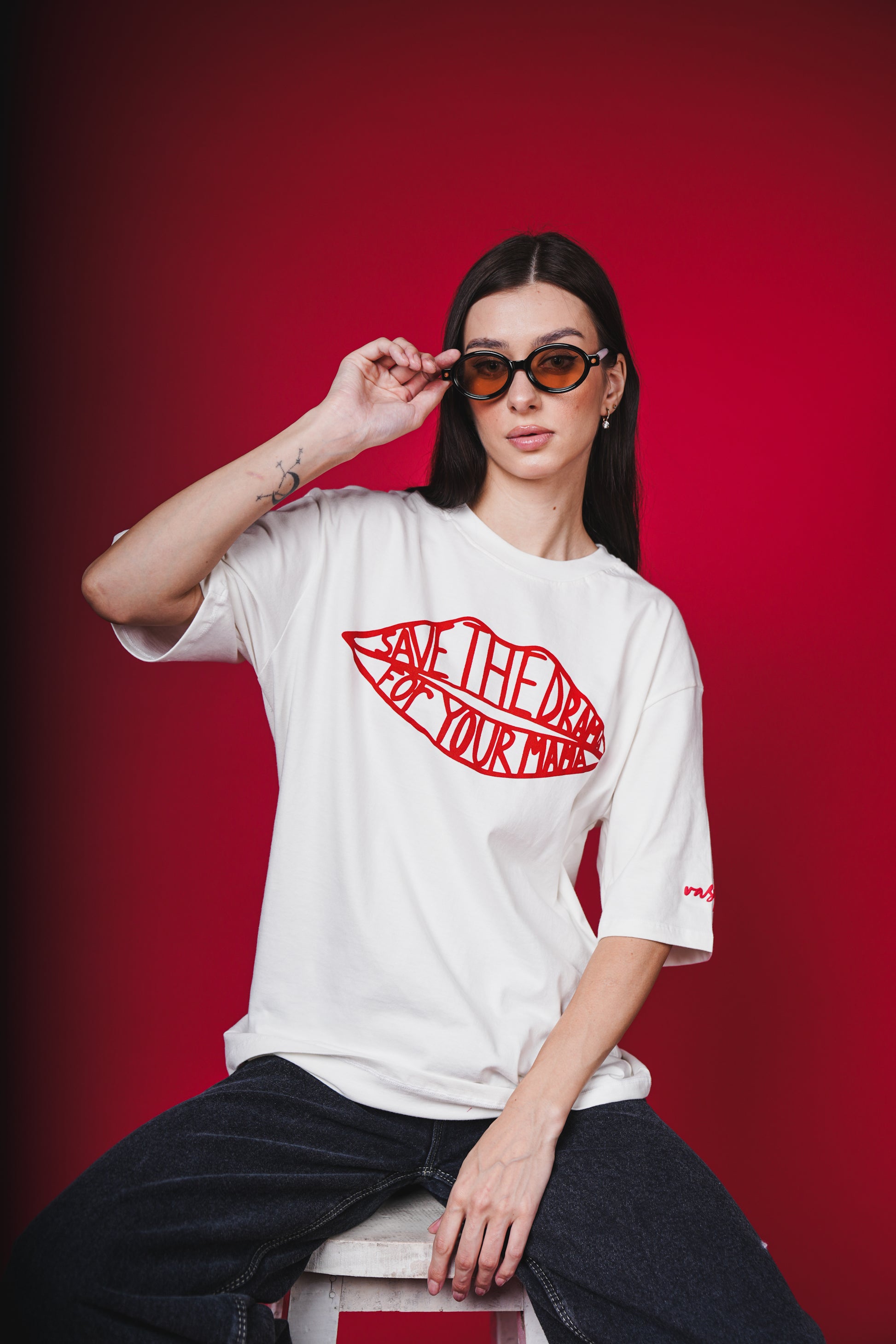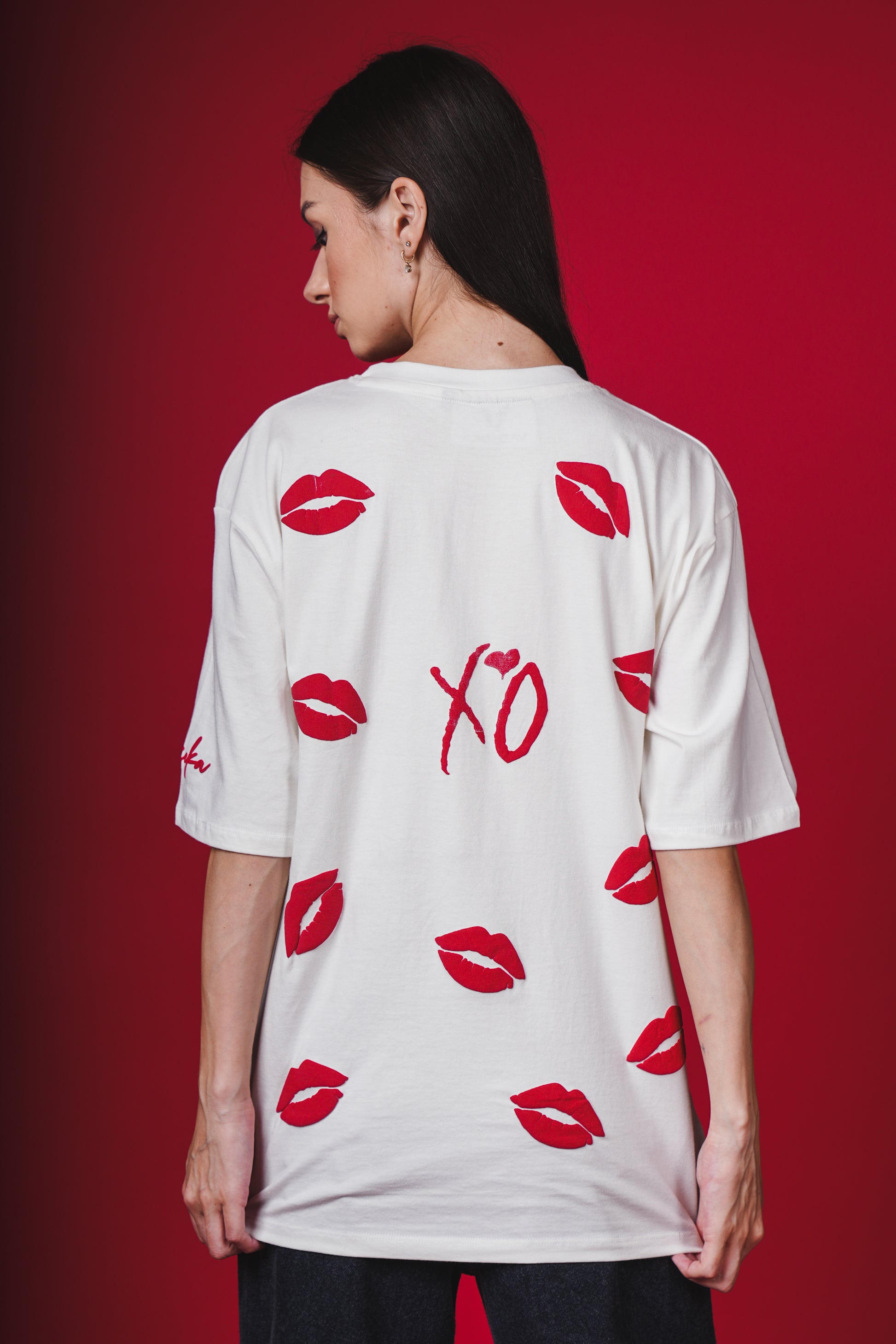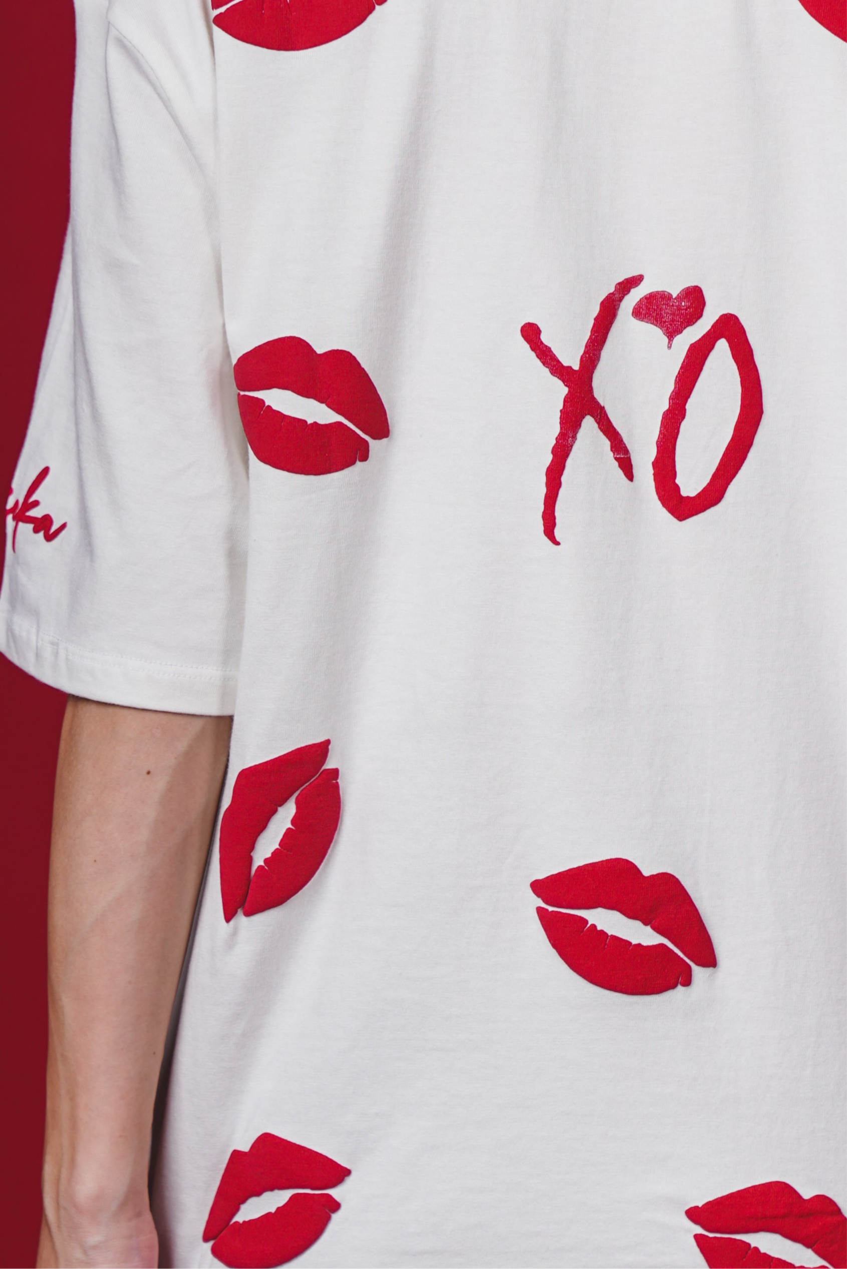 Flip it around and the back steals the show: scattered red lip prints with a playful “XO” puff-printed at the center, adding just the right amount of flirt. Finished with subtle sleeve branding, it’s the perfect mix of sass, street, and comfort.