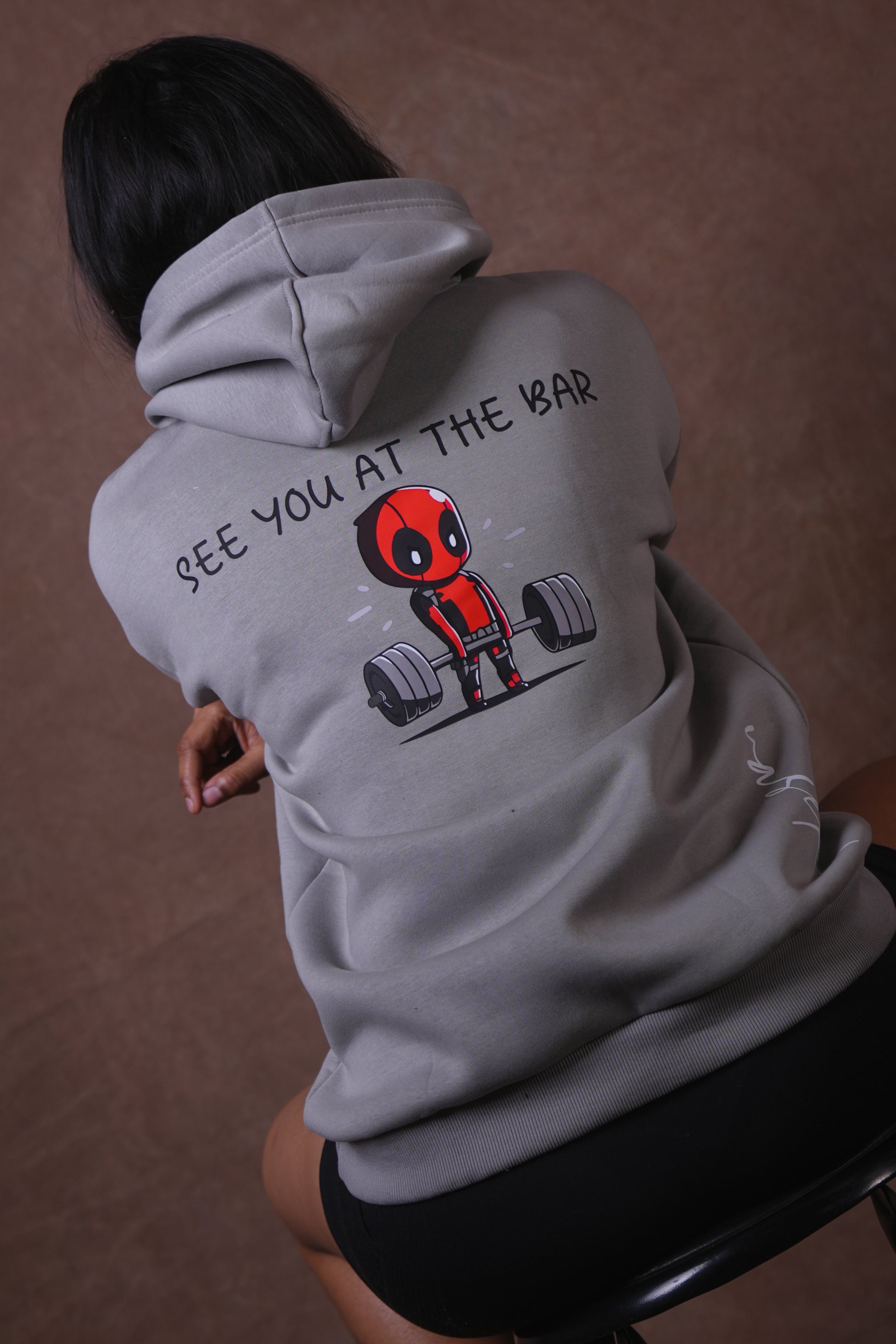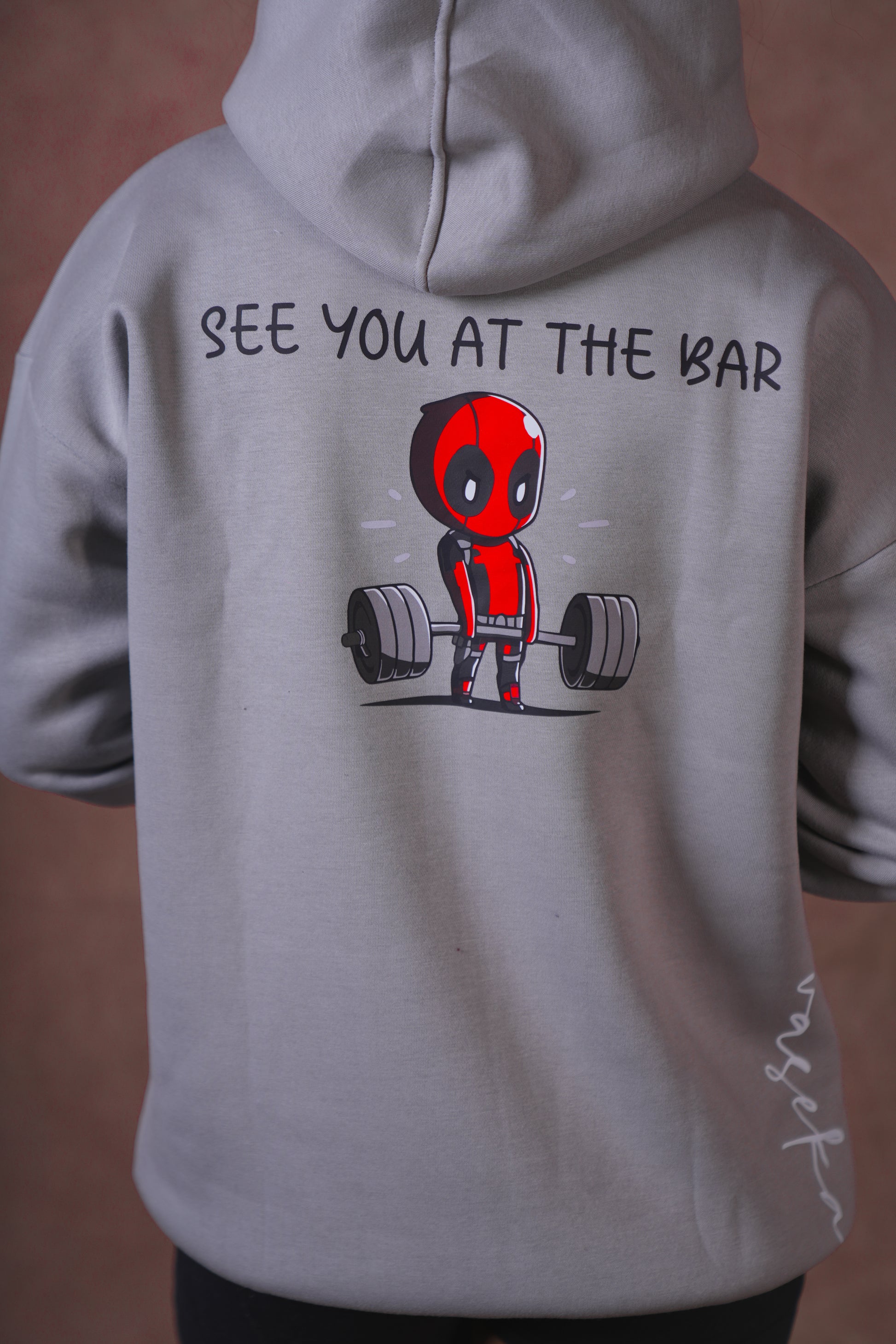 - Design: A stylized depiction of Deadpool lifting weights, accompanied by the text "See You at the Bar".
